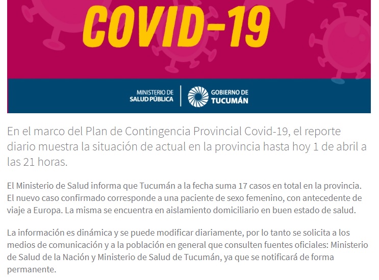 La información es dinámica y se puede modificar diariamente, por lo tanto se solicita a los medios de comunicación y a la población en general que consulten fuentes oficiales: Ministerio de Salud de la Nación y Ministerio de Salud de Tucumán, ya que se notificará de forma permanente.