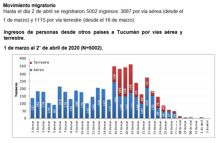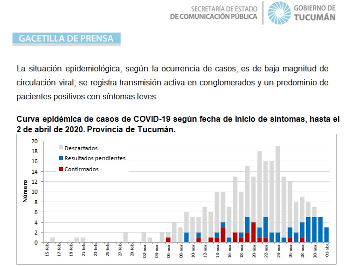 Se registraron 5 nuevas muertes. 4 Hombres, dos residentes en la provincia de Buenos Aires de 87 y 72 años; otro de 60 años, residente en la provincia de Chaco; otro de 76 años, de nacionalidad española residente en la provincia de Mendoza; y una mujer de 53 años, residente en la provincia de Buenos Aires. Al momento la cantidad de personas fallecidas es 42.