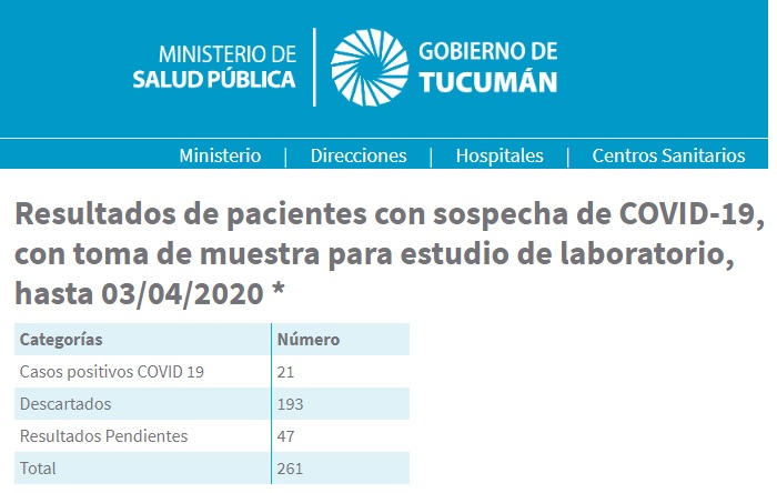 El Ministerio de Salud de la Nación proporcionó el informe vespertino y Tucumán no tiene casos positivos este viernes. Aunque si se registró en la mañana de hoy un deceso, un hombre de 65 años.