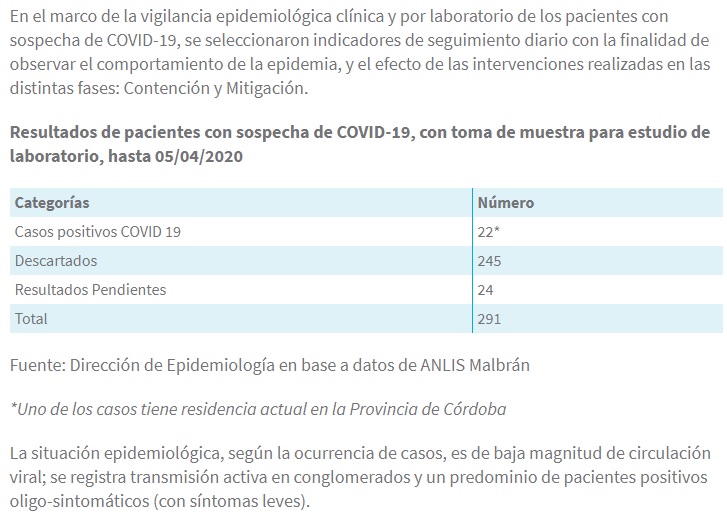 Mantiene los 22 pacientes positivos de coronavirus que informó el Ministerio de salud de la provincia.