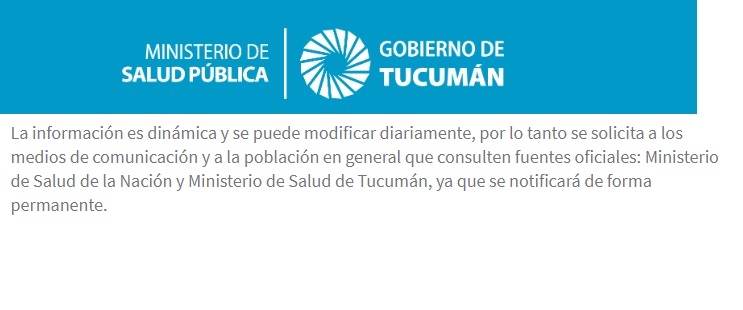 La información es dinámica y se puede modificar diariamente, por lo tanto se solicita a los medios de comunicación y a la población en general que consulten fuentes oficiales: Ministerio de Salud de la Nación y Ministerio de Salud de Tucumán, ya que se notificará de forma permanente.