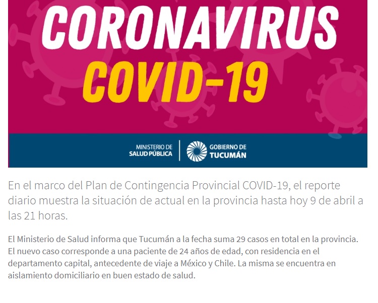 El Ministerio de Salud informa que Tucumán a la fecha suma 29 casos en total en la provincia. El nuevo caso corresponde a una paciente de 24 años de edad, con residencia en el departamento capital, antecedente de viaje a México y Chile. La misma se encuentra en aislamiento domiciliario en buen estado de salud.