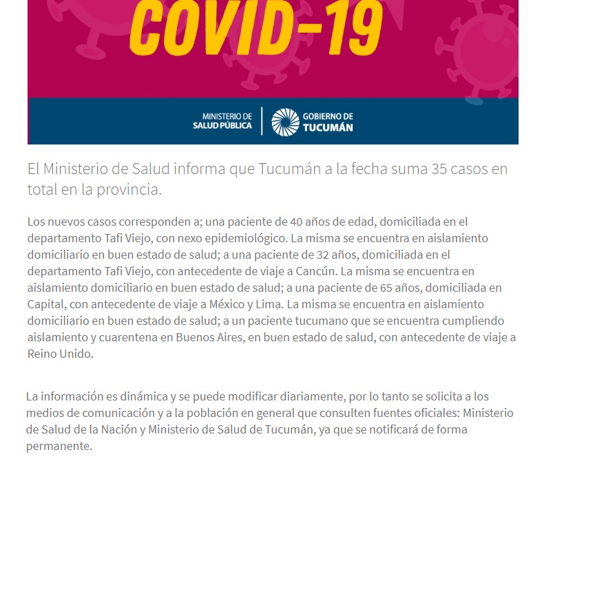 El Ministerio de Salud informa que Tucumán a la fecha suma 35 casos en total en la provincia.