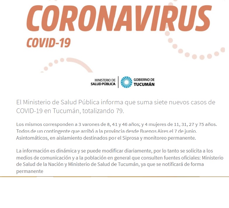 La información es dinámica y se puede modificar diariamente, por lo tanto se solicita a los medios de comunicación y a la población en general que consulten fuentes oficiales: Ministerio de Salud de la Nación y Ministerio de Salud de Tucumán, ya que se notificará de forma permanente
