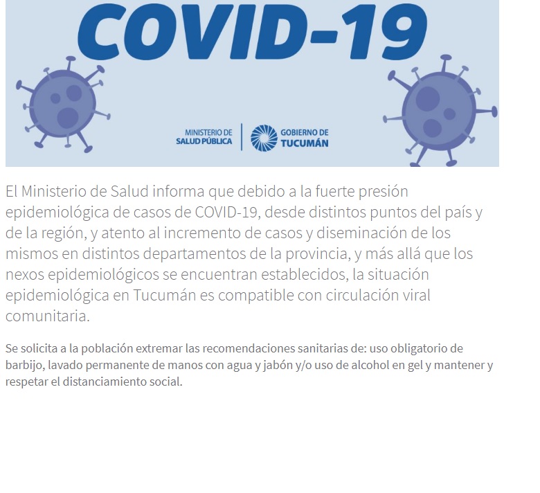 El ministerio de Salud informó que debido a la fuerte presión epidemiológica de casos de COVID-19, desde distintos puntos del país y de la región, y atento al incremento de casos su diseminación en distintos departamentos de la provincia, y más allá que los nexos epidemiológicos se encuentran establecidos, la situación epidemiológica en Tucumán es compatible con circulación viral comunitaria.