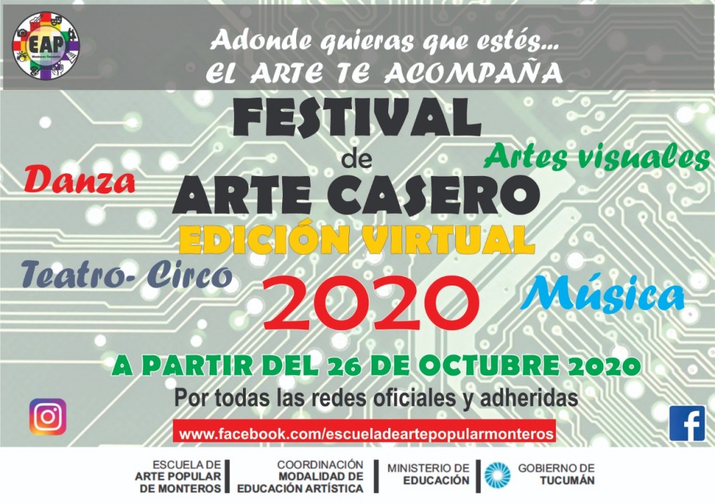 A partir de hoy todos los días desde las 19 Hs. "Intervenciones artísticas" de producciones realizadas por alumnos de EAPM. Por las circunstancias actuales y en el contexto del COVID - 19, el tradicional FESTIVAL DE ARTE CALLEJERO, se realizará de modo virtual transformandose "temporalmente" en FESTIVAL DE ARTE CASERO. Producciones realizadas por alumnos, coordinadas por profesores de la EAPM, podrán disfrutarse a través de sus REDES SOCIALES y de aquellos que quieran "compartir" las mismas. A seguir disfrutando del ARTE POPULAR LATINOAMERICANOCOMPARTIR: