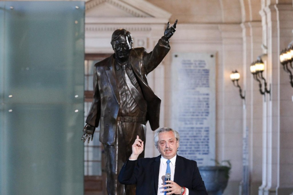 Durante la ceremonia, el jefe de Estado descubrió en el hall central del edificio la estatua recuperada y restaurada de Kirchner, que se encontraba en Ecuador y fue repatriada a comienzos de mes, y aseguró: “El destino existe y alguien quiso que el 27 de octubre del año pasado ganáramos las elecciones, y volviéramos a poner en la Casa de Gobierno un Presidente, una Vicepresidenta y funcionarios preocupados por los que peor están, por darles derechos y voz a los que les cuesta expresarse”. “Y eso coincidió con que se cumplan hoy diez desde que Néstor nos dejó físicamente”, agregó el mandatario, quien estuvo acompañado por el jefe de Gabinete, Santiago Cafiero y ministros del Gabinete nacional; el presidente de la Cámara de Diputados, Sergio Massa; gobernadores de distintas provincias; intendentes de Buenos Aires; los secretarios Generales de la CGT y la CTA; representantes de organismos de Derechos Humanos y personalidades del ámbito de la cultura. El mandatario recordó que, al asumir la presidencia argentina en 2003, “Néstor hizo cosas que muchos creíamos imposibles desde poner una Corte Suprema digna al frente del Poder Judicial, terminar con la libertad de los genocidas, trabajar por el derecho de los hijos cuyos padres desaparecieron, abrazarse con Estela, Tati y Hebe, luchadores eternas de los Derechos Humanos en los peores épocas de la Argentina” y reflexionó: “Néstor fue capaz de devolverle a toda una generación de argentinos la idea de que la política tenía sentido y que la política era el camino”.