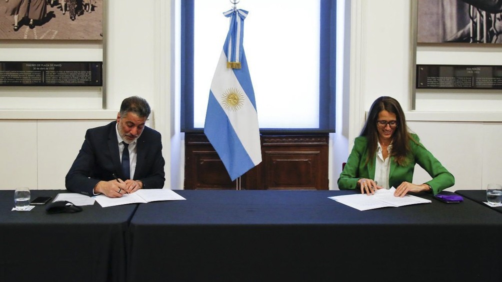 La ministra de las Mujeres, Géneros y Diversidad, Elizabeth Gómez Alcorta, y el secretario de Medios y Comunicación Pública, Francisco Meritello, firmaron este jueves un convenio "para avanzar hacia una profunda transformación institucional".