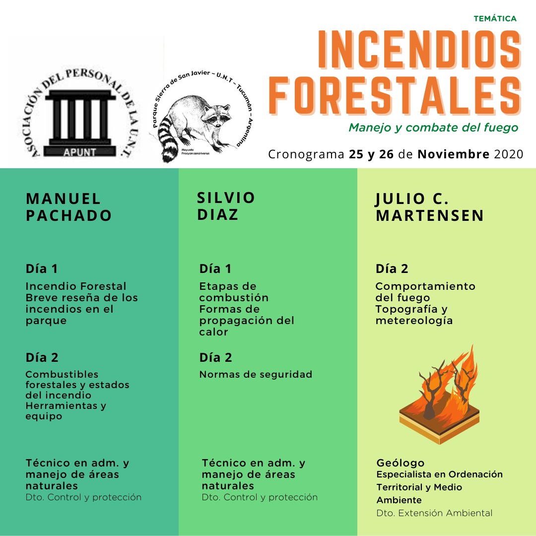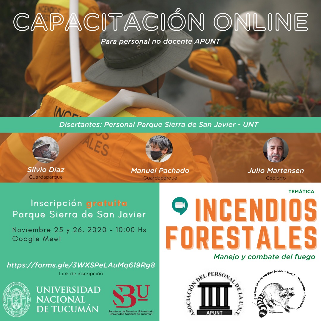 Los días miércoles 25 y jueves 26 de noviembre de 2020, a partir de las 10 hs, se dictará la primera Capacitación online gratuita para Personal Nodocente de la UNT, sobre “Incendios forestales: manejo y combate del fuego”, dictada por especialistas del Parque Sierra de San Javier.  La actividad es organiza la Secretaría de Bienestar Universitario (SBU), a cargo del Ing. Gustavo Vitulli, y coordinada por el Director Ejecutivo del Parque, Lic. Rodolfo Salinas Collado. Disertantes: Personal del Parque Sierra de San Javier - UNT.