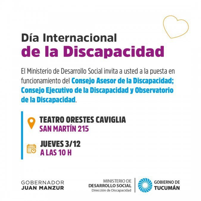 La Municipalidad de San Miguel de Tucumán realizará también un acto en conmemoración del Día Internacional de las Personas con Discapacidad, hoy jueves a las 20 hs, en avenida Mate de Luna al 1.600, frente al Monumento al Bicentenario.