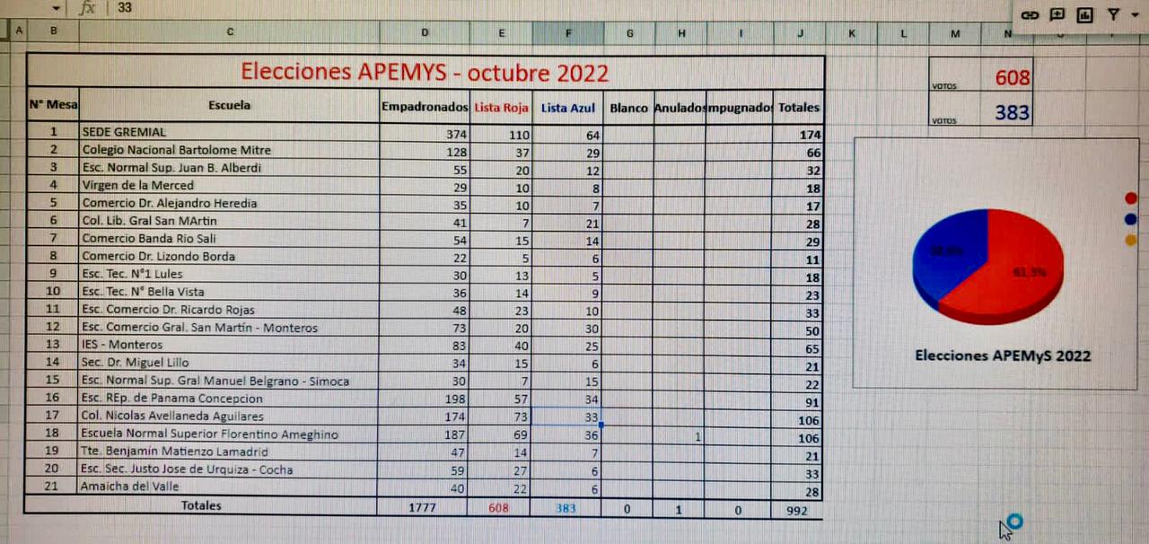 Al cierre de los comicios comenzó el escrutinio en las 21 escuelas, que se votaron en toda la provincia. La lista Roja se impuso en todas las mesas. Finalmente se conocieron los números alrededor de las 19:30 hs que la lista opositora ya no podía revertir: 608 para la Roja y 383 para la Azul.