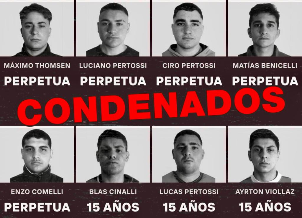 Por decisión unánime, los jueces determinaron condenar a Máximo Thomsen (23), Ciro Pertossi (22). Enzo Comelli (22), Matías Benicelli (23) y Luciano Pertossi (21) a prisión perpetua por encontrarlos como coautores del delito de “homicidio doblemente agravado por el concurso premeditado por dos o más personas por alevosía en concurso ideal de lesiones leves”, dicho en otras palabras, son culpables de la muerte de Fernando y de las agresiones recibidas por parte de las personas que intentaron defenderlo en el momento del salvaje ataque.