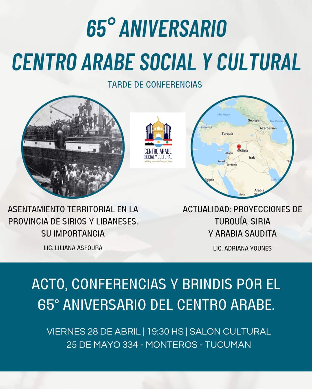 La institución invita a la comunidad en general, este viernes 28 de abril, desde las 19.30 hs, al acto oficial y posterior brindis en celebración del 65° aniversario. Además, se presentarán dos charlas en una tarde de conferencias muy especial: “Asentamiento territorial en la provincia de sirios y libaneses. Su importancia” a cargo de la Licenciada Liliana Asfoura y “Actualidad: proyecciones de Turquía, Siria y Arabia Saudita” a cargo de la Licenciada Adriana Younes.