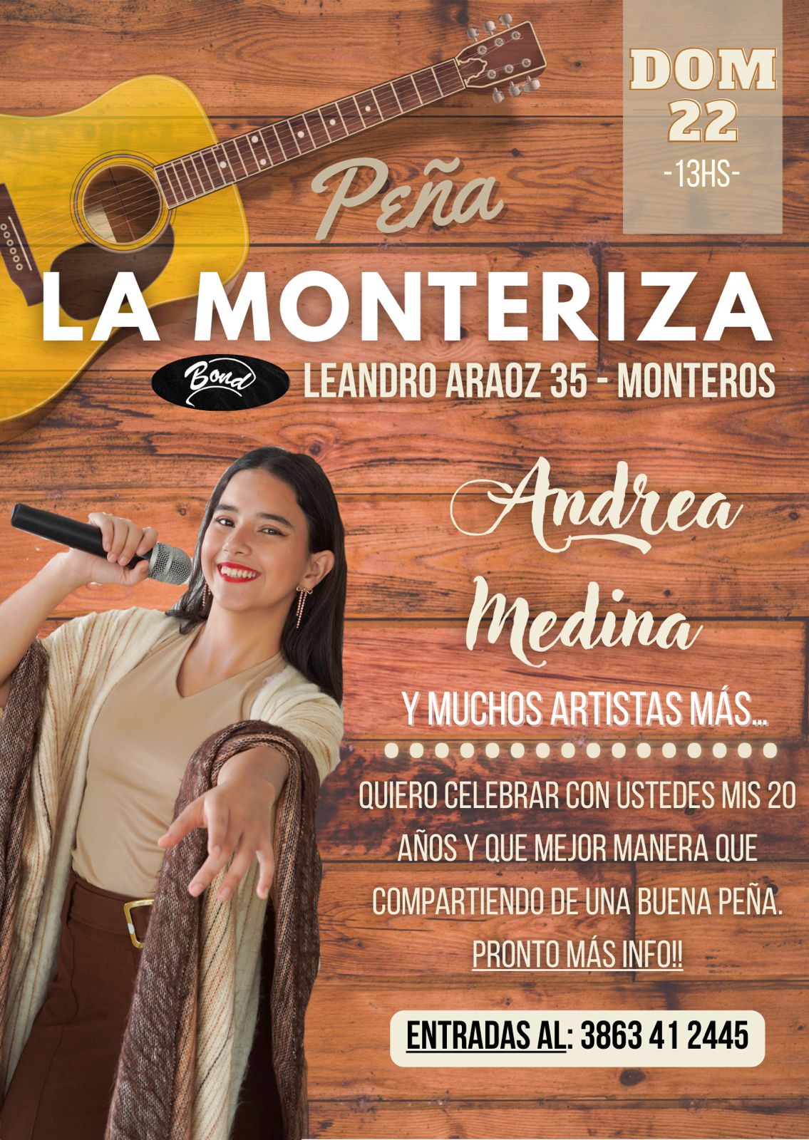 Entusiasmada por celebrar su cumpleaños numero 20, Andrea Medina, artista de Monteros, organiza una peña folcklorica para el domingo 22 de marzo. En BOND, pub al frente de plaza Bernabé Aráoz, a partir de las 13 hs