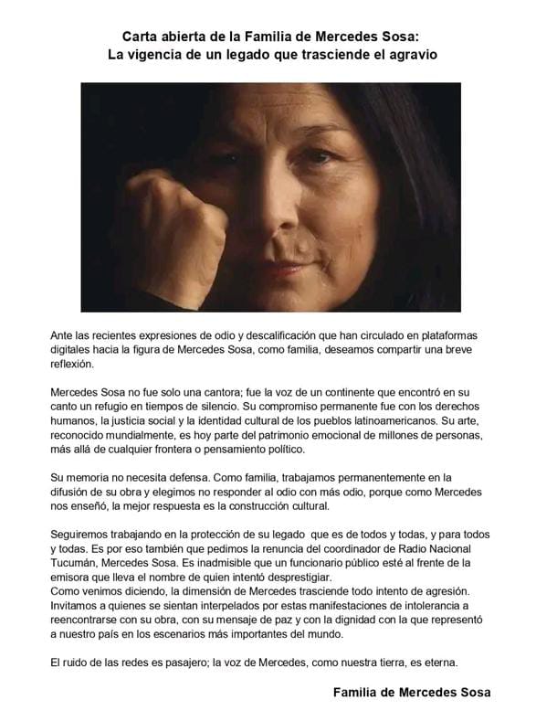 El pasado sábado, 28 de marzo, Adrian Sosa, sobrino de la cantante Mercedes Sosa, encabezó una serenata en las puertas de Radio Nacional, Tucumán, acompañados de Nancy Pedro y músicos locales. Se convocó mediante un flyer que invitaba a que lleven su voz y caja, para homenajear y defender la identidad cultural tucumana.
