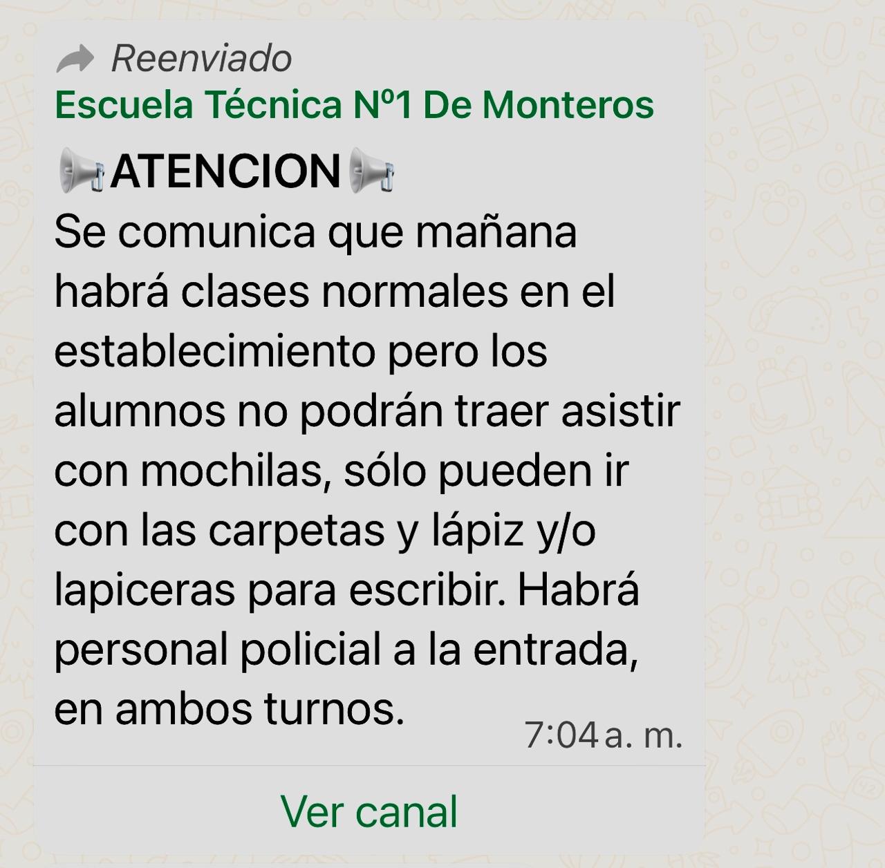 Los directivos del establecimiento, Esc. Técnica de Monteros, envió un mensaje por WhatsApp, a los padres informando la medida de que no se podía ingresar con mochila y advertían que habría presencia policial en el horario de acceso al establecimiento.