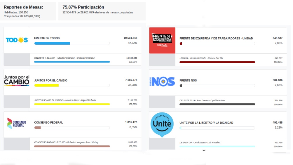 Con el 87,53 % de las mesas escrutadas, el candidato a presidente por el Frente de Todos, Alberto Fernández, obtiene el 47,32% de los votos por sobre el 32,28% de Mauricio Macri, de Juntos por el Cambio, y el 8,35% de Roberto Lavagna, de Consenso Federal, en las Primarias Abiertas Simultáneas y Obligatorias (PASO).