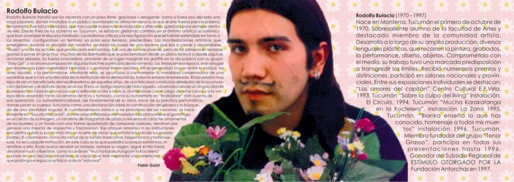 FUNDAMENTOS Señor presidente: Héctor Rodolfo Bulacio (Rodo) fue un artista plástico Tucumano nacido en Monteros, provincia de Tucumán el 1° de octubre de 1970 y asesinado el 10 de marzo de 1997 con tan solo 27 años. Desde pequeño tenía una atracción hacia el arte, a los cuatro años empieza a pintar e inventaba historias. A los 5 años no lo querían recibir en el Jardín de Infantes ya que los maestros decían que tenía una mentalidad e inteligencia de un niño de primaria por lo que con 5 años ingresa a primer grado. A los 8 años cuando estaba en cuarto grado ganó su primer premio, fue una pintura que hizo para el “Día de la Tradición”, a partir de ese momento comenzó su desarrollo en la parte artística hasta el día de su muerte. En la secundaria estuvo involucrado en el Centro de Estudiantes, se encargaba de la decoración de los eventos que realizaba su escuela, le encantaba decorar y que todo quede a su manera. Sus estudios primarios y secundarios son realizados en la ciudad de Monteros. Es egresado del Bachillerato especializado en Ciencias, físico- matemáticas de la Escuela Normal Superior “Teniente General Julio A. Roca”. En 1988 se radica en la ciudad de San Miguel de Tucumán. En 1992 asiste al Taller “Xilos”, allí adquiere una formación básica en diferentes técnicas de grabado que se evidencia en sus tempranos premios. Es estudiante de la Licenciatura en Artes Plásticas -Taller matutino y Taller de pintura de la Facultad de artes de la Universidad Nacional de Tucumán (UNT) y adscripto estudiantil en la Cátedra “Práctica de Taller II de Dibujo y Pintura” en 1994. También se dedica a la escritura. En 1996 inicia su actividad como docente particular en su “Taller de Primavera”. Es fundador del “Grupo Tenor Grasso”, un grupo en el cual participaban también Jorge Lobato Coronel y Claudia Martínez, el Grupo era una propuesta neo-informalista porque planteaban alternativas a los modos formales que ofrecía la cultura hegemónica, de esta manera instauraron un referente artístico y grupal en el arte de Tucumán, integrando las artes plásticas a lo teatral, los vestidos y los cuerpos son objetos artísticos, el cuerpo-modelo, vestido-objeto son partes inseparables del discurso. Ambos significantes se condensan en un significado”. (Jorge Lobato) Rodo incursionó en todas las técnicas: grabados, pinturas, performance, instalaciones, fotografía. Ganador del “Subsidio Regional de Estímulo” otorgado por la “Fundación Antorchas” en 1997, premio que no pudo cobrar porque la muerte lo truncó. Al mismo tiempo, su familia al querer cobrar dicho subsidio, el Fondo Nacional de las Artes se lo denegó ya que el premio era para realizar un proyecto. La Universidad Nacional de Tucumán se hizo cargo del mismo realizando un libro sobre su vida y obra llamado: “Su vida es arte”. Andy Warholl, Pedro Almodovar, Leonardo Da Vinci y Federico Fellini eran sus creadores favoritos; trabajó con el kistch (y a veces con el melodrama) pero siempre admiró el barroco. En su obra aparece la ironía y la repetición; y en el medio del brillo y el color, sombras de resignación y melancolía. Una experiencia estética pueda ser comprendida como una acción artística provocando a partir de cualquier material y lugar, pero, hay un lugar hasta el cual hay que empujar esa provocación para que tenga testigos, para que pueda ser comprendida como una acción artística. Pablo Guiot, artista tucumano, escribió: “Rodolfo Bulacio transitó por los noventa con un paso firme, gracioso y arrogante. Como si fuera esa década, una larga pasarela, donde mostraba a un público asombrado la última tendencia, lo que el arte traería para la próxima temporada”. Según lo dicho por Bruno Juliano, Bulacio realizó, en las obras que podrían vincularse al pop, lo que Guiot llama “ataques amorosos a las instituciones”, como en su versión del escudo nacional argentino con corazones, margaritas y un código de barras que lo marca como un producto “vendible”, o la serie de obras en las que retrata la boda de sus propios padres, recorriendo el rito inicial de la familia tradicional heterosexual, desde el cual comenzó su propia vida, y así, explorando su origen, modela su identidad plástica que desafía mandatos. Podría identificarse a parte de la obra que ha dejado como un pop residual, como un eco que repite, imita y distorsiona una producción dominante en centros del capitalismo. El produjo desde un lugar marginal en relación a esos centros: los suburbios tucumanos y no lo disimuló. Pero Rodo caminando por la década de los noventa como en una pasarela, se transformó en un grito, espeso, que sigue generando ecos en producciones actuales después de veinte años de que la vida le fuera arrebatada. En plena convertibilidad pintó “One Rodo”, conocido también como “Rodólar”, el óleo de un billete en cuyo centro estaba su propia cara. También se destaca la obra “Escudo Nacional” donde en su centro lo rodea pintando delante de los laureles, “margaritas”, que para el significaban la belleza pura, la corona se refleja con el sol del escudo y rodeándolo también con corazones azules que recortó y pegó con telas. En 1995 realiza la Performance “Mucha Katanga en la coctelera”, donde “se casa con el arte” siguiendo todos los rituales de la ceremonia: vestido de novia, fiesta con torta de bodas, caravana de autos con bocinas sonando. Estaban invitados a la boda todos sus amigos realizando este acto alrededor del gran reloj en el Parque 9 de Julio de la ciudad de San Miguel de Tucumán, lugar emblemático de los tucumanos en donde las parejas recién casadas posan para las fotos. En medio del bullicio y los flashes, unas señoras comentan que la novia parece en realidad un joven. Mientras la madrina acomoda los pliegues del gran vestido blanco inmaculado y mientras el novio, también vestido de blanco, saludan y se prepara