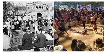 Los militantes agobiados por un calor más de verano que de primavera, buscaron descansar sus pies en la fuente como se hiciera simbólicamente en el 45 en un extraordinario bautismo peronistas.